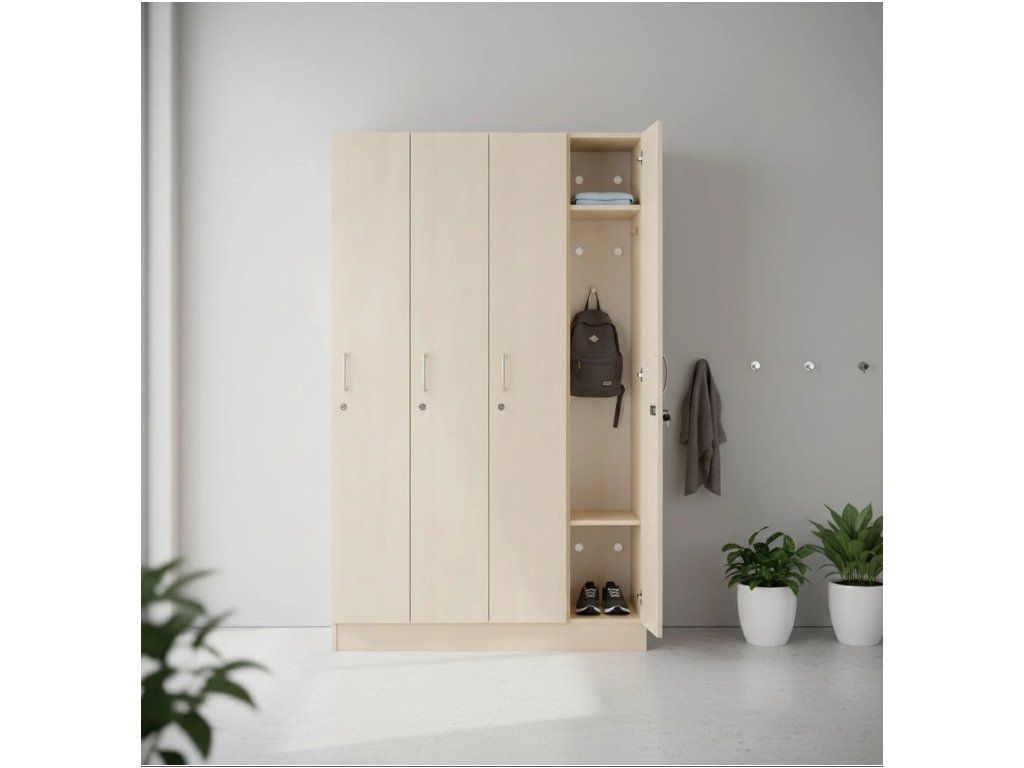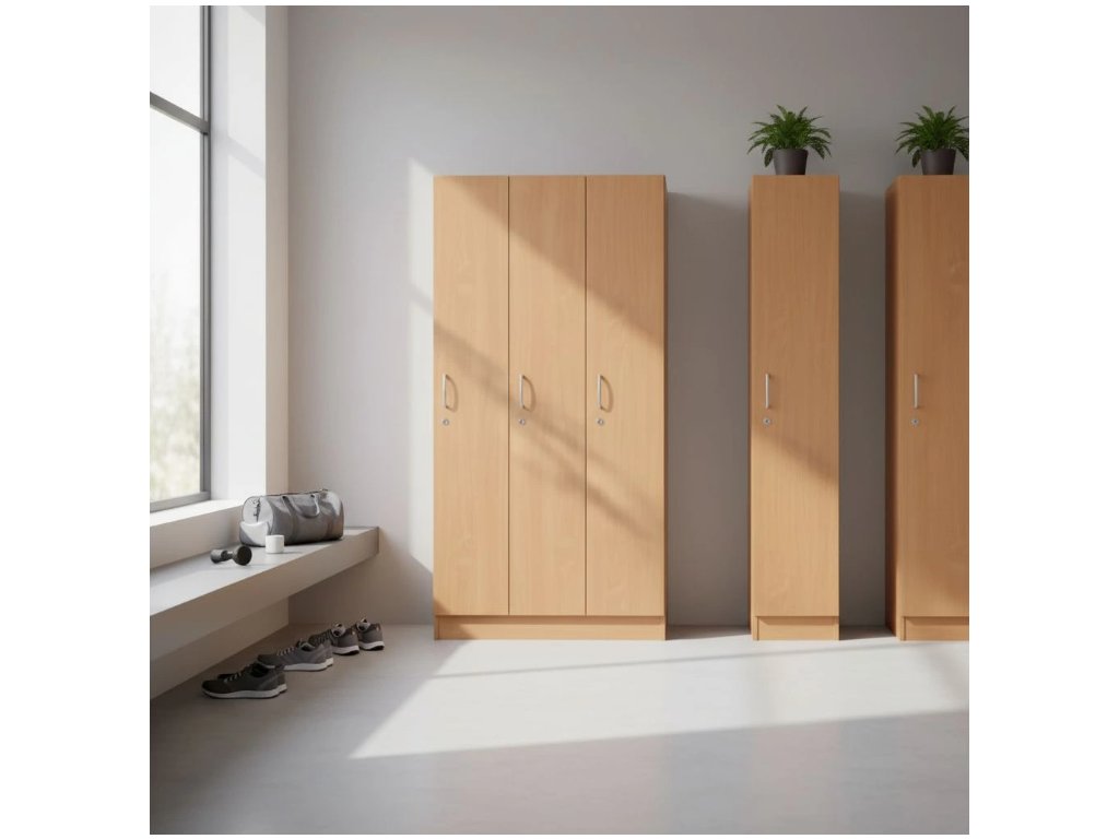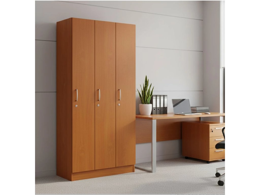 Kvalitní šatní trojskříňka ze série Visio. Je rozdělená do 3 samostatných uzamykatelných oddílů. Uvnitř každého oddílu se nachází 3 úložné prostory oddělené 2 policemi. Spodní prostor slouží k odložení obuvi, prostřední k zavěšení vašich svršků na praktický dvojháček a vrchní úložný prostor je určen k uložení osobních věcí. V zadní části jsou praktické průduchy, aby odložené oděvy lépe dýchaly. Dvířka jsou opatřená kovovými úchytkami a cylindrickými zámky. Provedení ve více barevných dezénech.