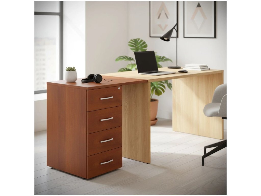 Kvalitní přístavný kontejner ze série nábytku Impress. Horní deska je vyrobena z laminované dřevotřísky o síle 22 mm, ostatní díly z desek LDT o síle 16 mm. Kontejner má centrální zamykání a kovové úchyty. Ve spodní části jsou umístěny rektifikační nožky s možností změnit výšku až o 10 mm. Provedení v různých barevných dezénech.