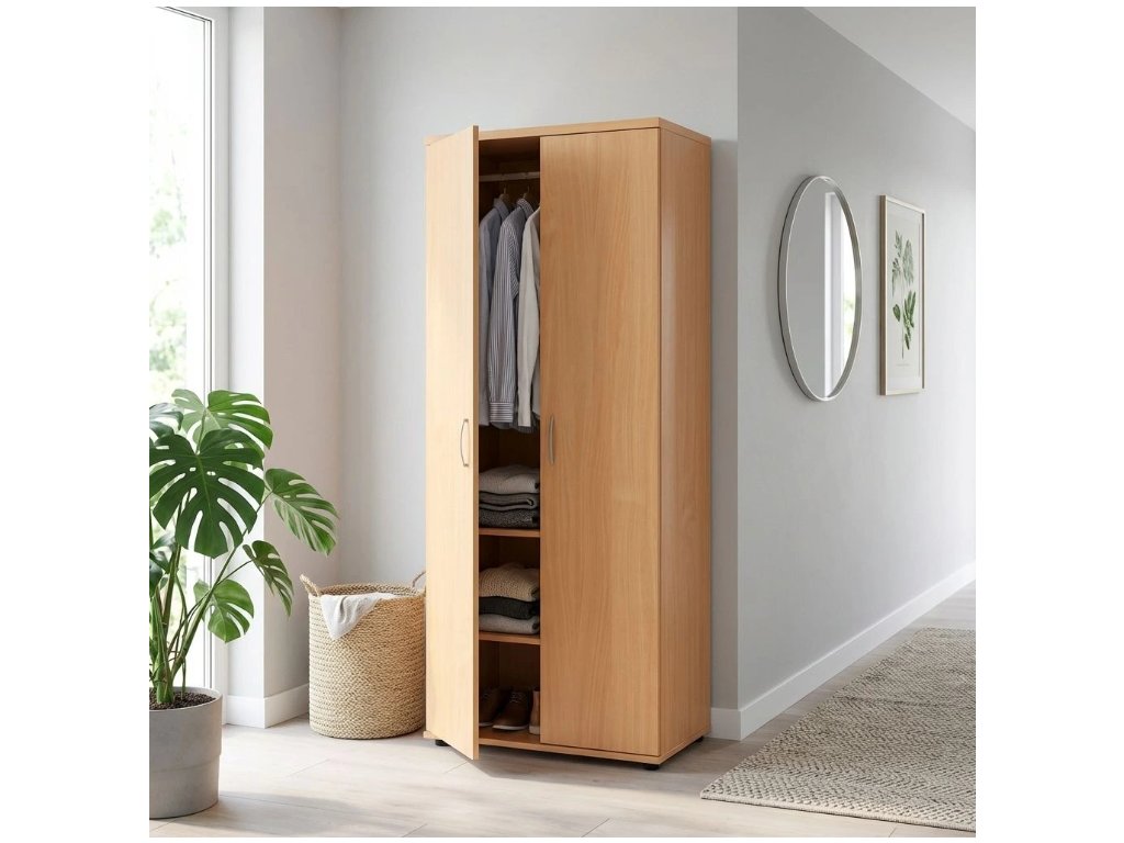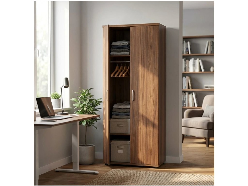 Kvalitní kancelářská skříň ze série Visio. Půda skříně je vyrobena z laminované dřevotřísky o síle 28 mm, ostatní díly z desek LDT o síle 18 mm. Součástí skříně jsou rektifikační nohy pro vyrovnání nerovností podlahy. Police mají vysokou nosnost. Dveře skříně jsou opatřeny kovovými úchyty. Součástí skříně je kovová věšáková tyč. Provedení v různých barevných dezénech.