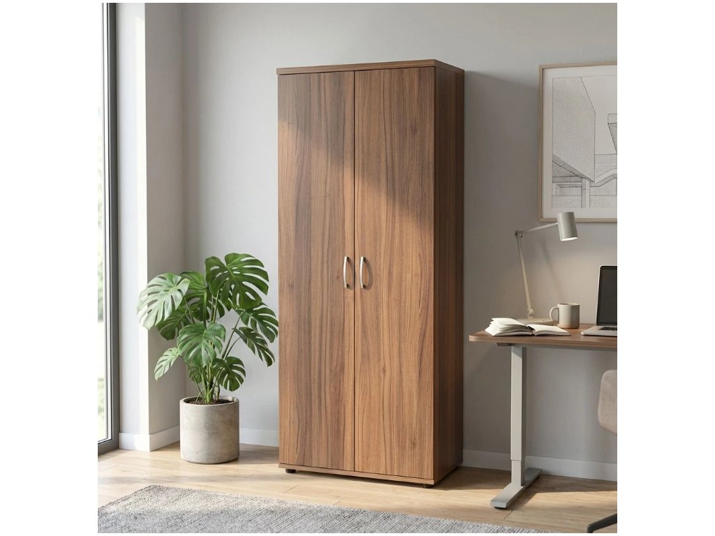 Kvalitní kancelářská skříň ze série Visio. Půda skříně je vyrobena z laminované dřevotřísky o síle 28 mm, ostatní díly z desek LDT o síle 18 mm. Součástí skříně jsou rektifikační nohy pro vyrovnání nerovností podlahy. Horní police má vysokou nosnost. Dveře skříně jsou opatřeny kovovými úchyty. Součástí skříně je kovová věšáková tyč. Provedení v různých barevných dezénech.