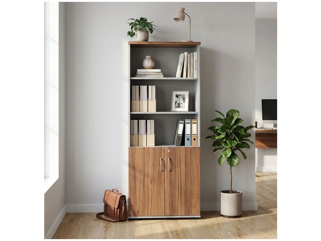 Kvalitní vysoká kancelářská skříň ze série Visio LUX. Půda skříně je vyrobena z laminované dřevotřísky o síle 28 mm, ostatní díly z desek LDT o síle 18 mm. Součástí skříně jsou rektifikační nohy pro vyrovnání nerovností podlahy. Police mají vysokou nosnost. Dveře skříně jsou opatřeny kovovými úchyty a jejich součástí jsou zámky. Provedení v různých barevných dezénech.