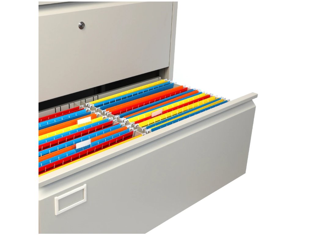 Dvouřadá kovová kartotéka Vám poskytne úložný prostor ve formě 3 zásuvek, které jsou přizpůsobeny pro archivaci dokumentů ve formátu A4. Každá zásuvka má nosnost až 40 kg. Výsuv je díky kuličkovému pojezdu lehký a velmi tichý. Konstrukce je vyrobena z pevného ocelového plechu v červené barvě odstínu RAL 3000. Kartotéka má centrální zamykání v podobě cylindrického zámku u horní zásuvky. Tímto typem zámku se uzamykají všechny zásuvky najednou. Na čelních stěnách jsou umístěny štítky pro vložení popisu.