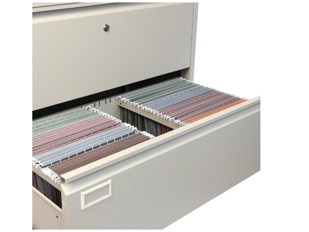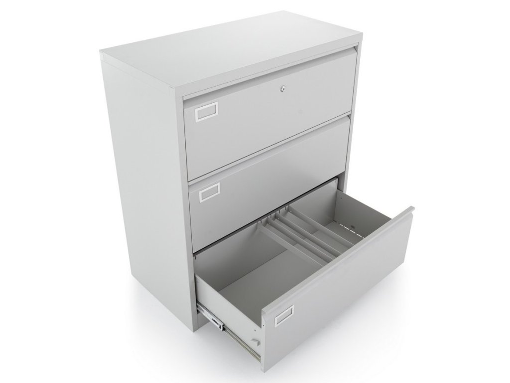 Dvouřadá kovová kartotéka Vám poskytne úložný prostor ve formě 3 zásuvek, které jsou přizpůsobeny pro archivaci dokumentů ve formátu A4. Každá zásuvka má nosnost až 40 kg. Výsuv je díky kuličkovému pojezdu lehký a velmi tichý. Konstrukce je vyrobena z pevného ocelového plechu v šedé barvě odstínu RAL 7035. Kartotéka má centrální zamykání v podobě cylindrického zámku u horní zásuvky. Tímto typem zámku se uzamykají všechny zásuvky najednou. Na čelních stěnách jsou umístěny štítky pro vložení popisu.