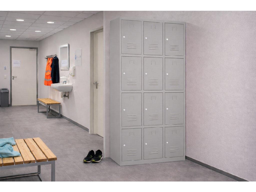 Kovová šatní skříň s šířkou 90 cm nabízí spoustu úložného prostoru. Skládá se z dvanácti samostatných skříněk. Ve dveřích jsou umístěny odvětrávací otvory a také mají výlisek pro štítek. Konstrukce je vyrobena z pevného ocelového plechu v šedé barvě odstínu RAL 7035. Všechny skříňky mají zamykání v podobě cylindrického zámku. Součástí jsou 2 klíče ke každému zámku.