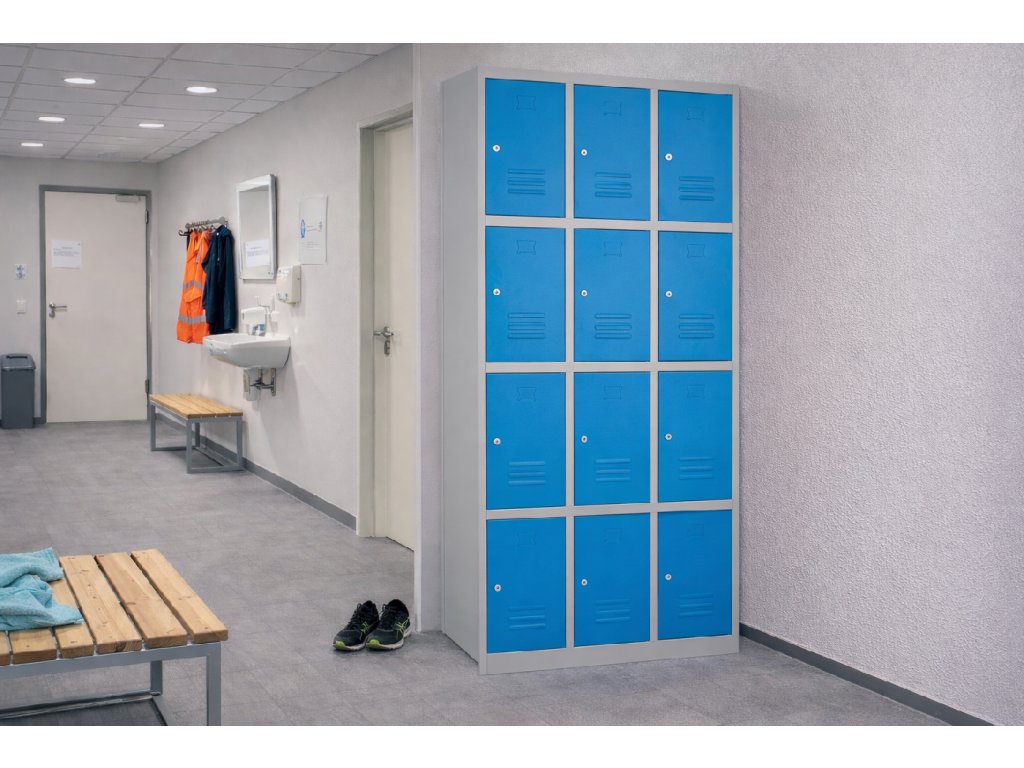 Kovová šatní skříň s šířkou 90 cm nabízí spoustu úložného prostoru. Skládá se z dvanácti samostatných skříněk. Ve dveřích jsou umístěny odvětrávací otvory a také mají výlisek pro štítek. Konstrukce je vyrobena z pevného ocelového plechu v modré barvě odstínu RAL 5012. Všechny skříňky mají zamykání v podobě cylindrického zámku. Součástí jsou 2 klíče ke každému zámku.