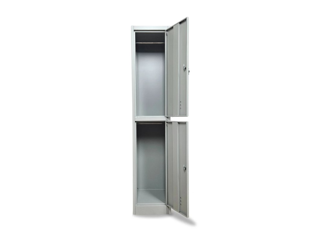 Kovová šatní skříň s šířkou 38 cm nabízí spoustu úložného prostoru. Skládá se ze dvou samostatných skříněk. Ve dveřích jsou umístěny odvětrávací otvory a také výlisek pro štítek. Konstrukce je vyrobena z pevného ocelového plechu v šedé barvě odstínu RAL 7035. Obě skříňky mají zamykání v podobě cylindrického zámku. Součástí jsou 2 klíče ke každému zámku.