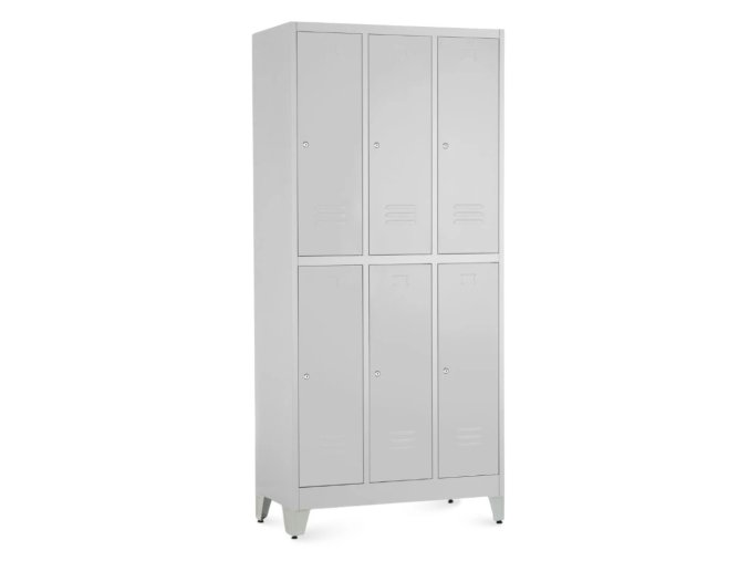 Kovová šatní skříň s šířkou 90 cm nabízí spoustu úložného prostoru. Skládá se ze šesti samostatných skříněk. Každá z nich má věšák. Ve dveřích jsou umístěny odvětrávací otvory a také prostor pro štítek. Konstrukce je vyrobena z pevného ocelového plechu v šedé barvě odstínu RAL 7035. Všechny skříňky mají zamykání v podobě cylindrických zámků.