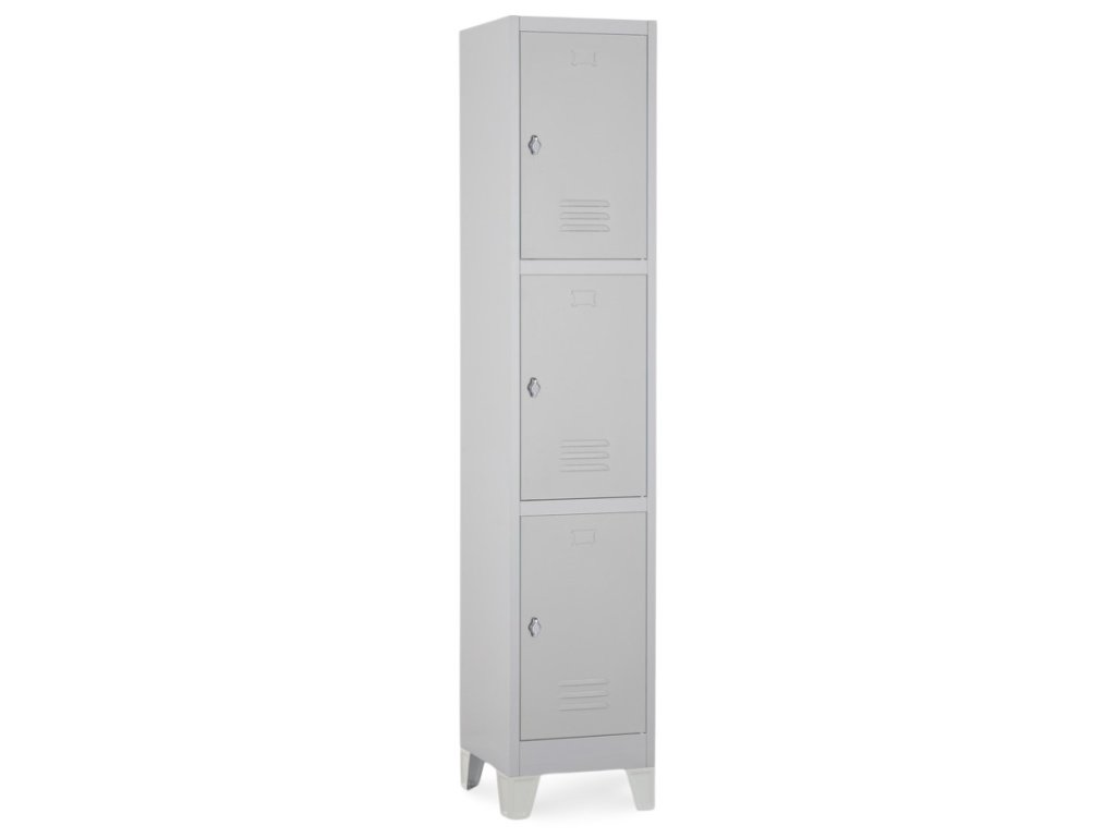 Kovová šatní skříň se šířkou 38 cm nabízí spoustu úložného prostoru. Skládá se ze třech samostatných skříněk. Ve dveřích jsou umístěny odvětrávací otvory a také prostor pro štítek. Konstrukce je vyrobena z pevného ocelového plechu v šedé barvě odstínu RAL 7035. Všechny skříňky mají zamykání v podobě otočného zámku.