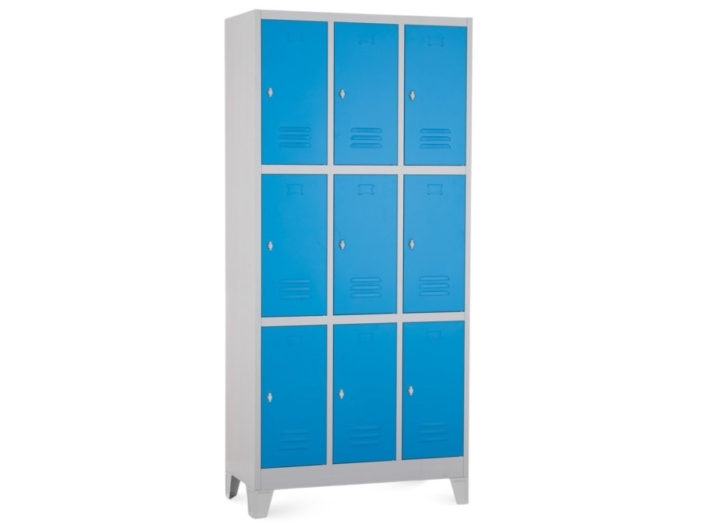 Kovová šatní skříň se šířkou 90 cm nabízí spoustu úložného prostoru. Skládá se z devíti samostatných skříněk. Ve dveřích jsou umístěny odvětrávací otvory a také prostor pro štítek. Konstrukce je vyrobena z pevného ocelového plechu v modré barvě odstínu RAL 5012. Všechny skříňky mají zamykání v podobě otočného zámku.